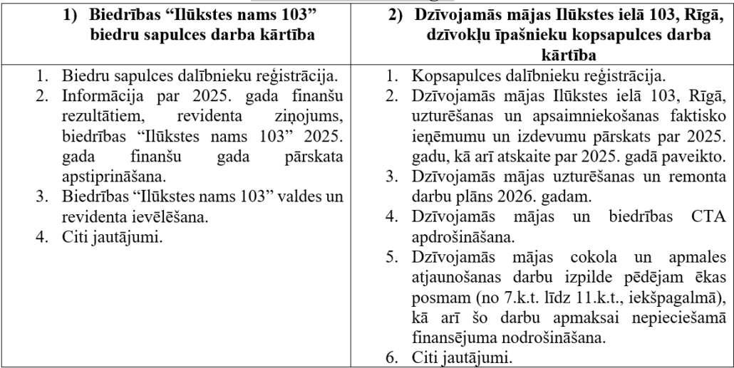Dzīvokļu īpašnieku biedrība „Ilūkstes nams 103” aicina Jūs piedalīties biedrības “Ilūkstes nams 103” biedru sapulcē un dzīvojamās mājas Ilūkstes ielā 103, Rīgā, dzīvokļu īpašnieku kopsapulcē.