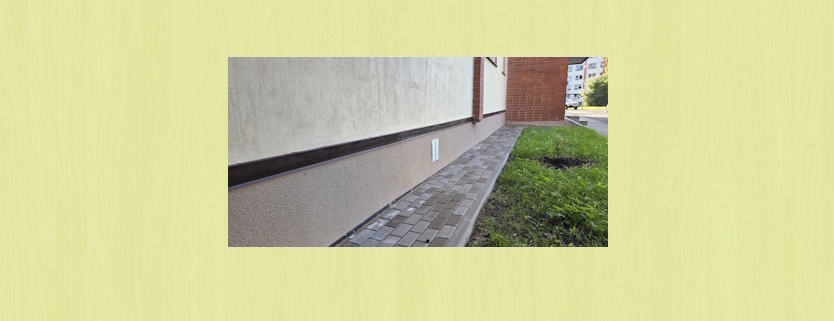 В рамках ремонтных работ, был выкопан и вывезен строительный мусор, заменен и уплотнен грунт, установлена гидроизоляционная мембрана, обустроена и утрамбована подушка из щебня (300 мм), обустроена новая отмостка из брусчатки (600 мм), а также выполнены работы по обновлению цоколя здания, с утеплением и выравниванием его поверхности, обновлением отделки декоративной штукатуркой с тоном (Caparol).